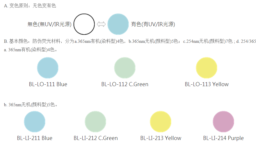 本系列產(chǎn)品特殊熒光體在可見光光源下,呈現(xiàn)白色或接近透明色,在不同波長光源下(254nm、 365 nm、 850 nm) 顯現(xiàn)一種或多種熒光色澤,包括有機(jī)、 無機(jī)、余暉等特殊效果,色彩鮮艷亮麗,熒光標(biāo)識材料主要用于生產(chǎn)防偽油墨和標(biāo)志塑料。
